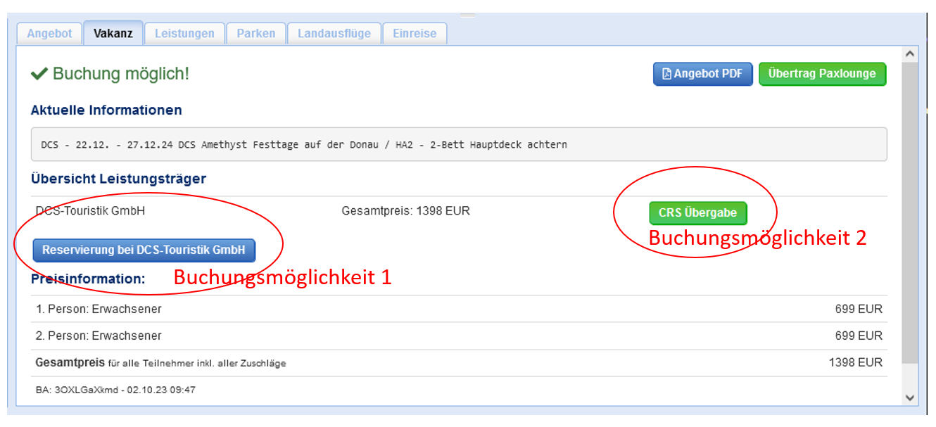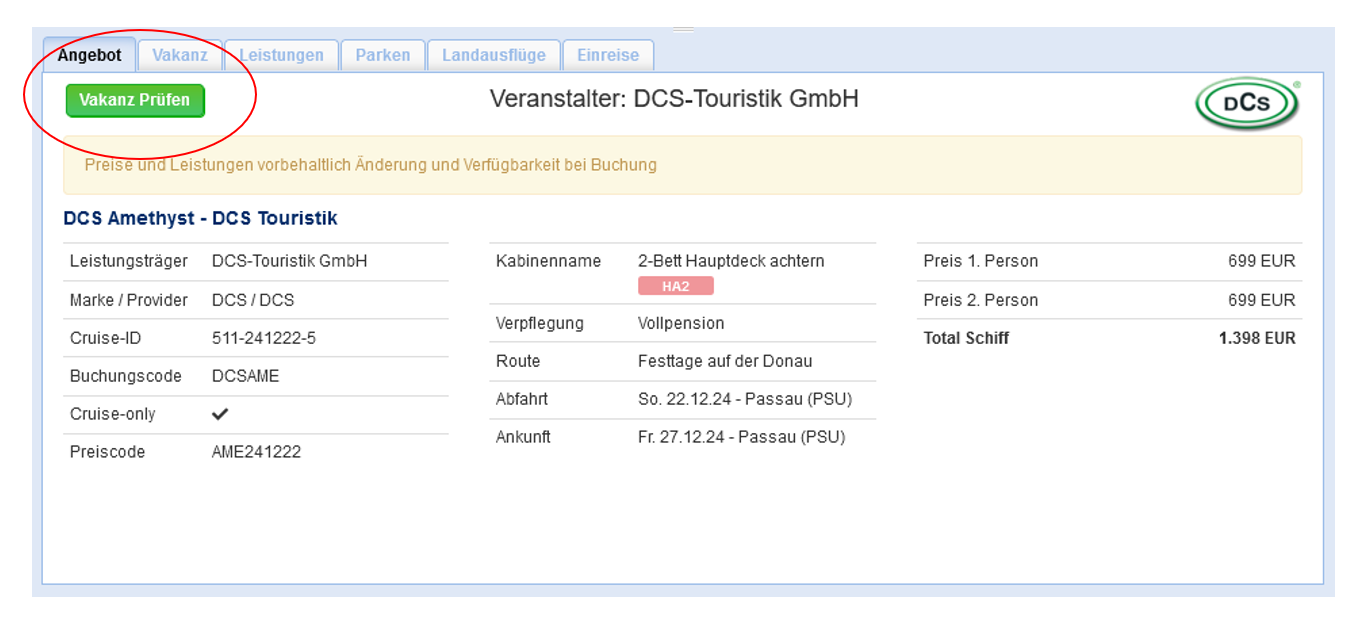 DCS-Flussreisen in CruiseCompass suchen & buchen! Mit nur wenigen Klicks finden Sie hier schnell die besten und günstigsten Angebote und können unsere Flusskreuzfahrten wie gewohnt in Ihr CRS übertragen oder die gewählte Reise auch ganz ohne CRS bequem und einfach über den Button „Reservierung bei DCS-Touristik GmbH“ optionieren oder einbuchen. Beide Buchungsmöglichkeiten sind in unseren Abbildungen für Sie dargestellt: